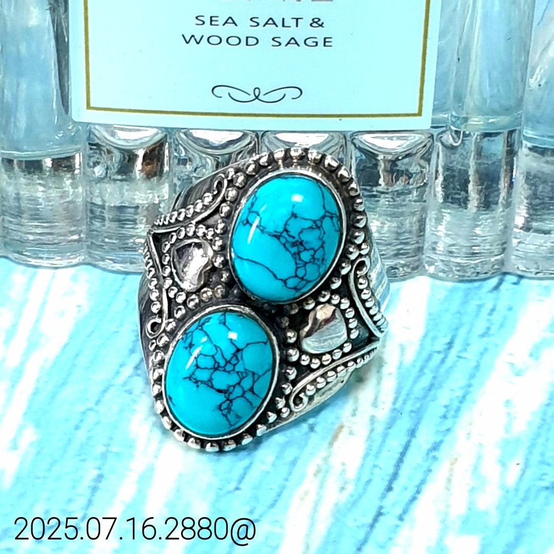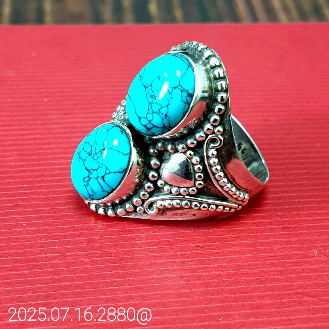 精選天然綠松石,色澤湛藍、紋理自然,搭配999純銀手工鑲嵌,古典鏤空與立體浮雕點綴,呈現復古異域風情。雙石造型象徵雙重守護與能量,招財避邪、提升魅力,男女皆宜,獨一無二的個性配件。